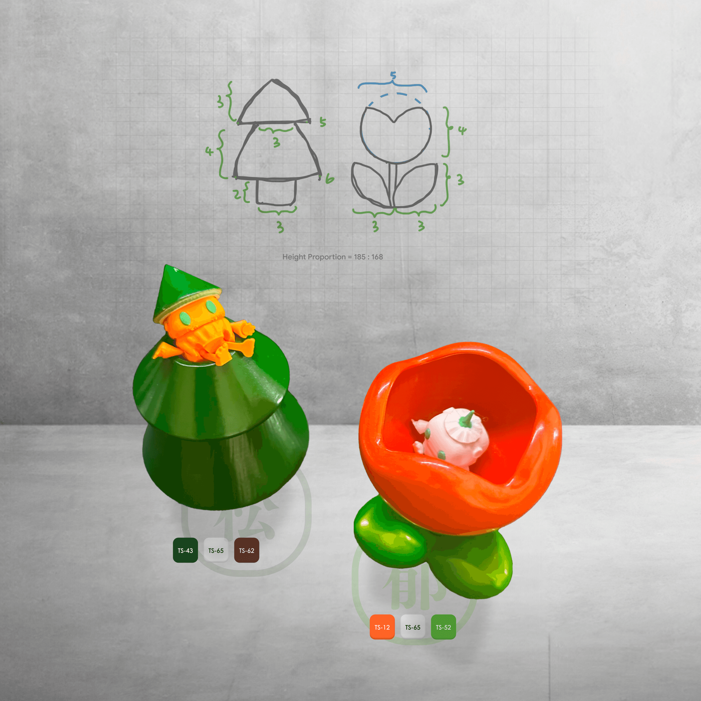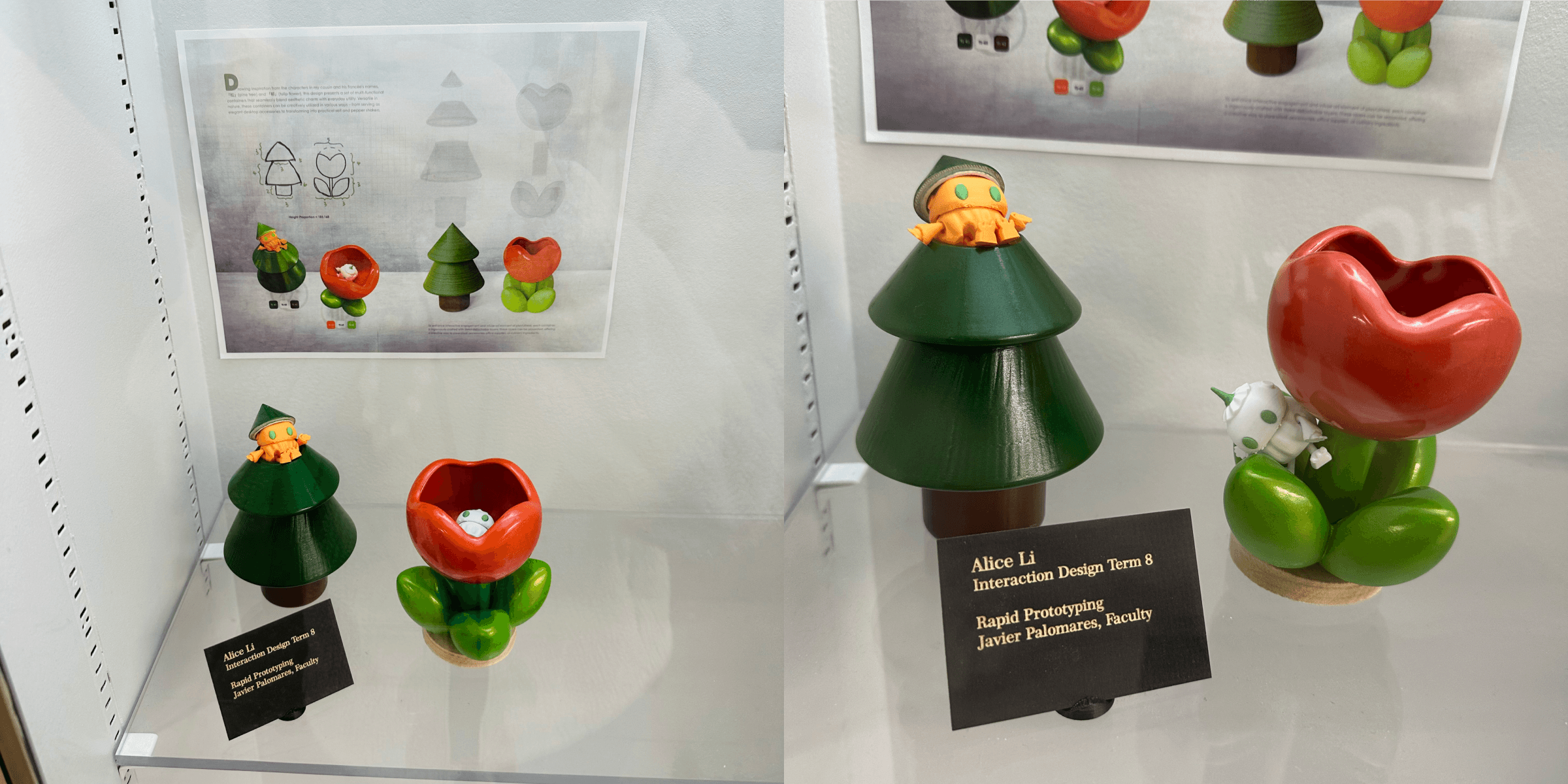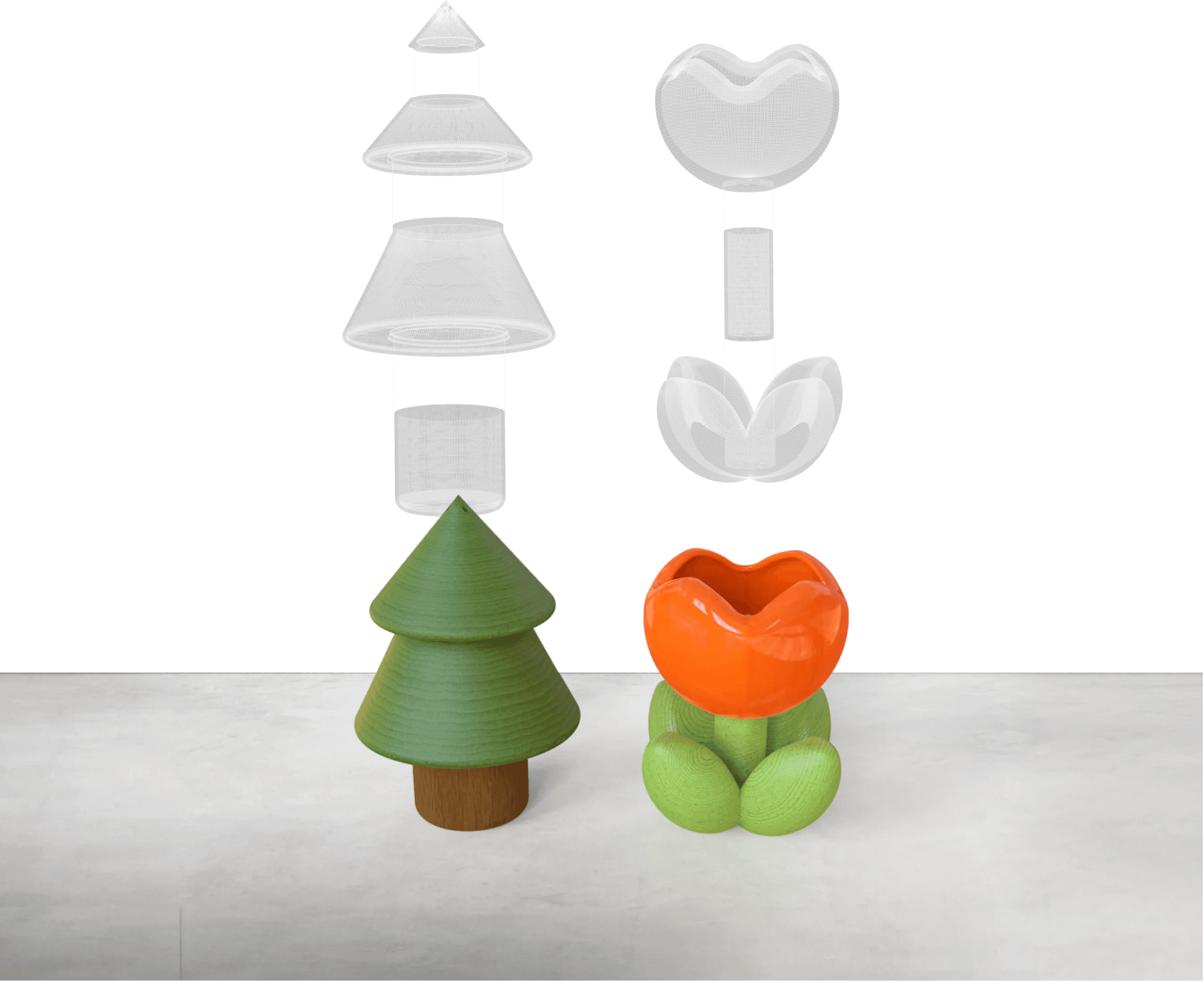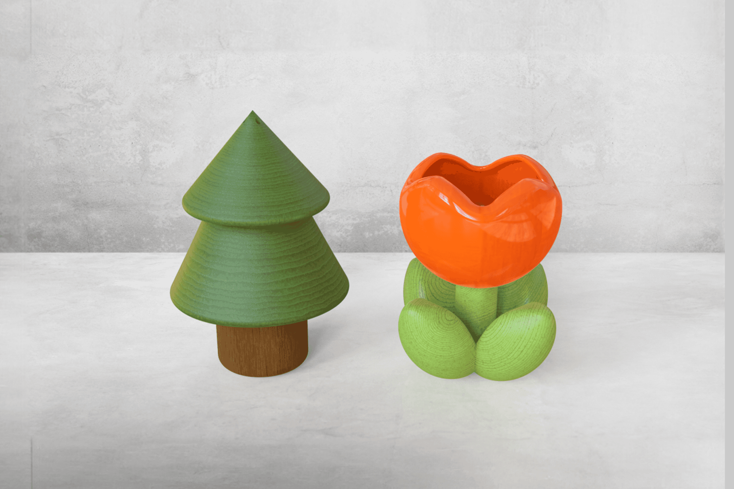 Drawing inspiration from the characters in my cousin and his wife's names, 「松」(pine tree) and 「郁」(tulip flower), this design presents a set of multi-functional containers that seamlessly blend aesthetic charm with everyday utility. Versatile in nature, these containers can be creatively utilized in various ways – from serving as elegant desktop accessories to transforming into practical salt and pepper shakers.